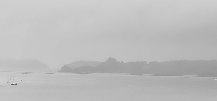 This piece weaves multiple strands of hope and harmony and contains a spiritual soothing lightness. The inspiration, as is so often in my art, is nature. It’s spring here, and we are having the wettest time. It seems like the whole world is getting lots of rain. This wonderful white mist settles over the sea and islands—all most like a bridal veil.