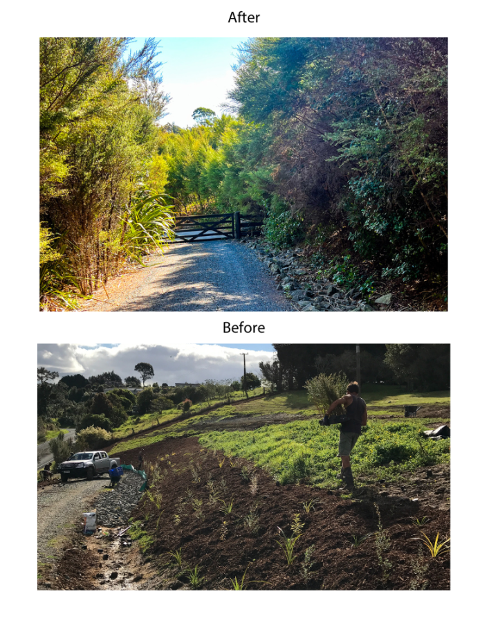 We planted nikaus and natives outside the original gates. We also made the entrance more secure with electric gates operated with a PIN. We also moved giant volcanic rocks, which bring so much joy when we arrive home.