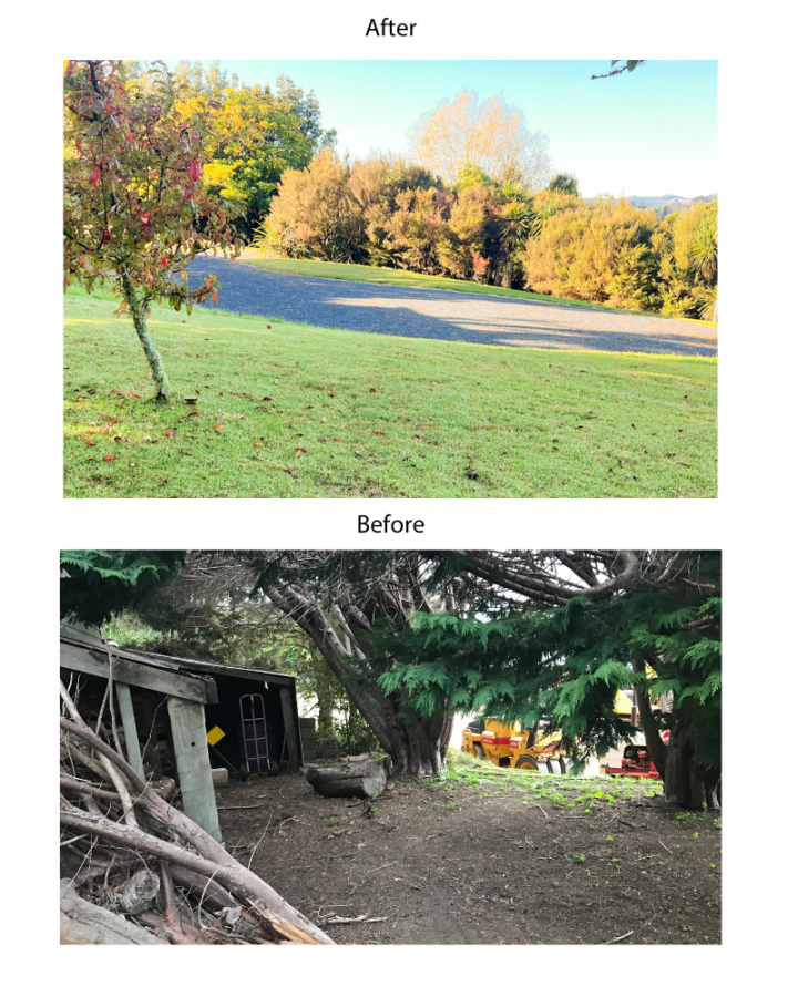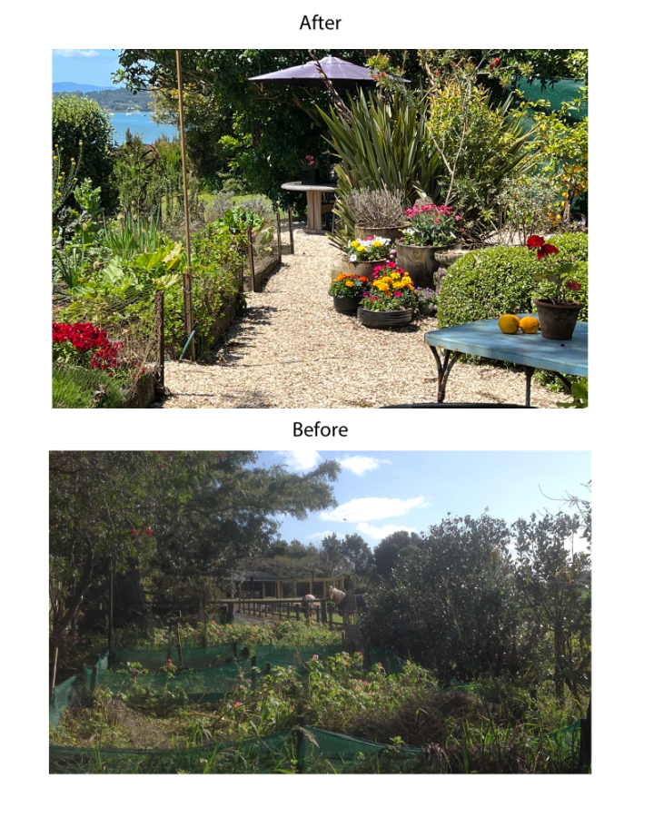 One day they moved, the friendship died, and so did the aging tree. We tried so hard to save the beautiful tree, and even consulted an arborist, who told us the tree was dying. now have beautiful new neighbours and three stunning Nikau trees which bring so much pleasure. It’s till one of our favourite views—the shade tree(s) and views of the sea. But now the powerlines stretching across the view are buried and the flows without steps and paths and a drive to the shed. There is much more beauty and harmony—and nothing distracting our joy