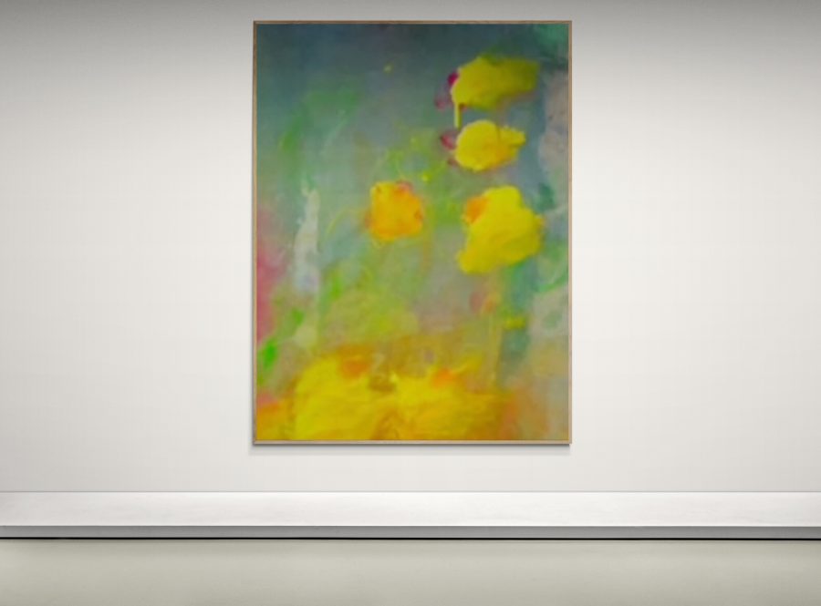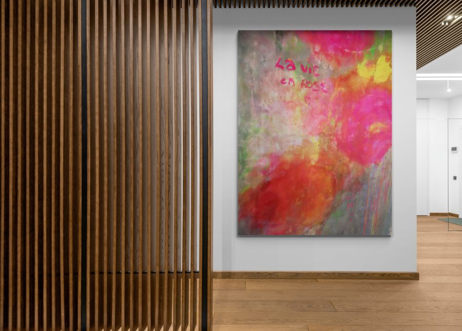 The work below by me, New Leaf, was inspired by Brian’s love of vertical colour waves. It sold to a lovely lady who said the banana yellows, and tropical lime greens reminded her of growing up in Fiji. Look how perfectly it went in her home. The word “love” added to the painting as I created it during Covid lockdowns and fear mongering, reminded my new collector of her mum who had passed away. Meant to be!